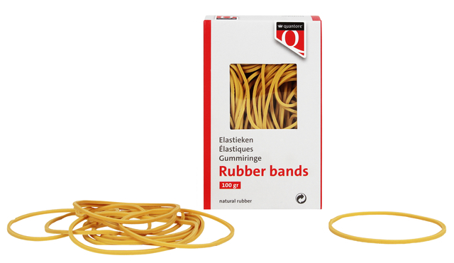De elastiekjes van Quantore in maat 18 zijn perfect geschikt voor het bundelen van documenten, kaarten en andere materialen van gemiddeld formaat. Met een afmeting van 80x1,5x1mm bieden ze een goede rekbaarheid en betrouwbare grip. De bruine elastieken zijn gemaakt van 80% milieuvriendelijk, zuiver pararubber en vormen een duurzame keuze voor dagelijks gebruik. Verpakt in een doos van 100 gram, ideaal voor op kantoor, op school of thuis.