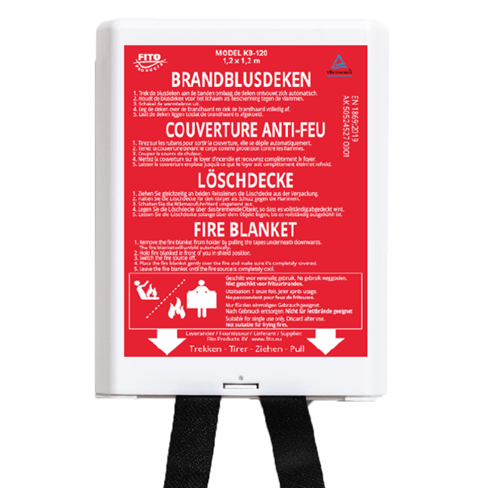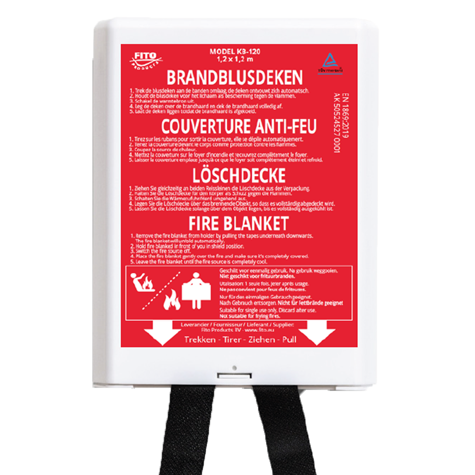 In geval van brand trekt u de deken in één keer uit de kunststof koker en legt hem over het vuur.