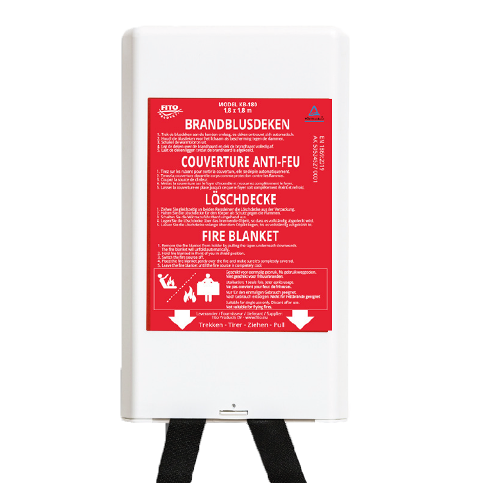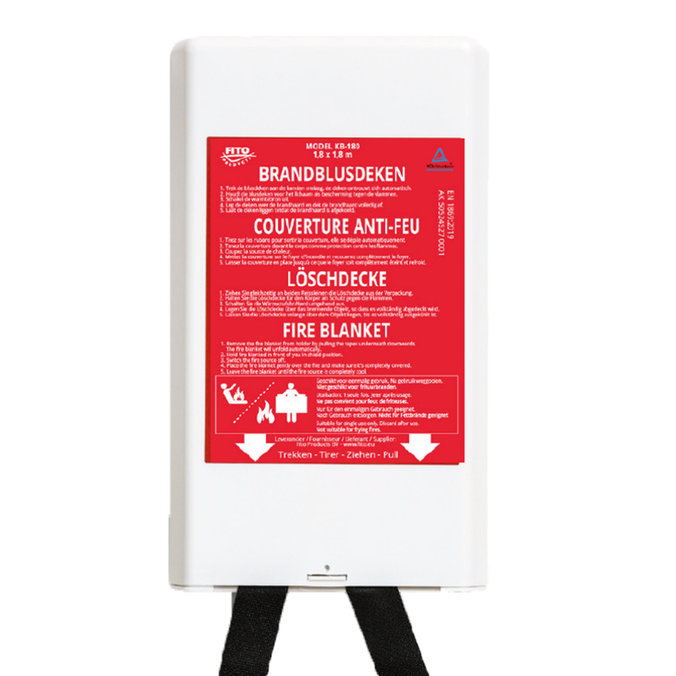 In geval van brand trekt u de deken in één keer uit de kunststof koker en legt hem over het vuur.