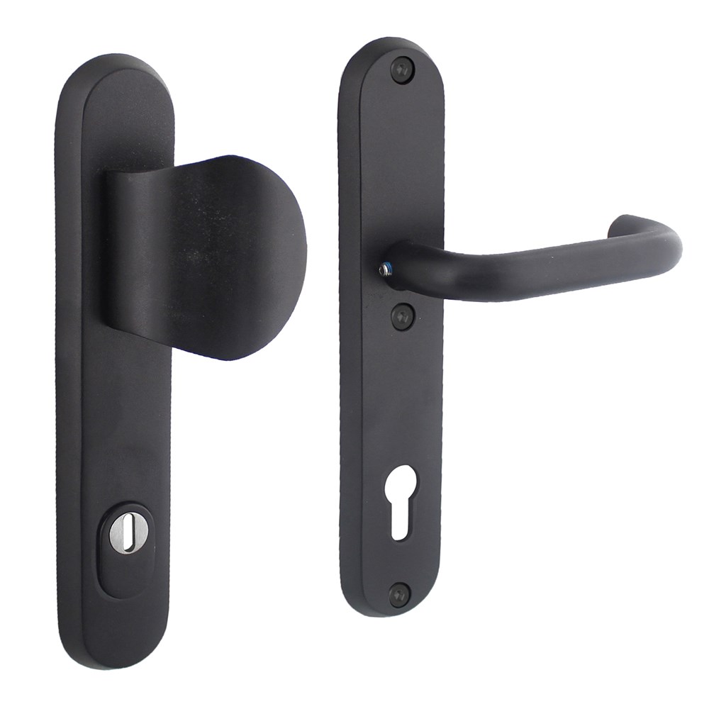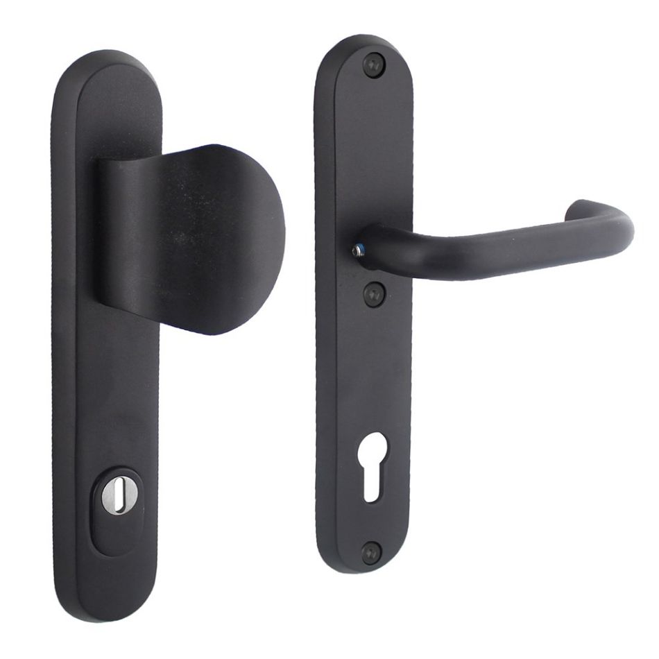 Deze ovale set voordeurbeslag met bescherming tegen inbraak is SKG*** gekeurd. Deze set heeft een greep aan de buitenzijde en een bijpassende kruk aan de binnenzijde en is vervaardigd uit roestvast staal en naderhand voorzien van een zwarte coating. Het veiligheidsbeslag heeft een profielcilindergat maat van 92 mm en is voorzien van kerntrekbeveiliging, waardoor de cilinder wordt beschermd tegen het uittrekken en uitboren van de cilinderkern. Het voordeurbeslag is tevens voorzien van nokken, waardoor hij beter op zijn plek wordt gehouden. Deze set wordt geleverd inclusief bevestigingsmateriaal voor montage.
