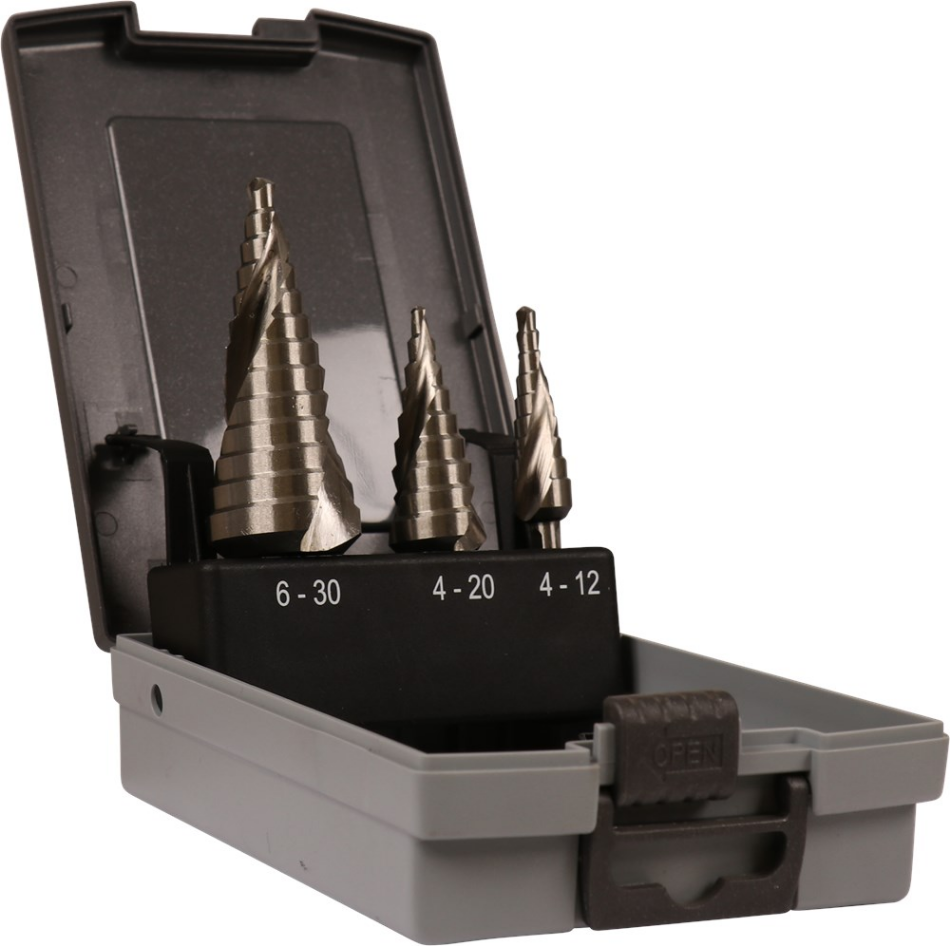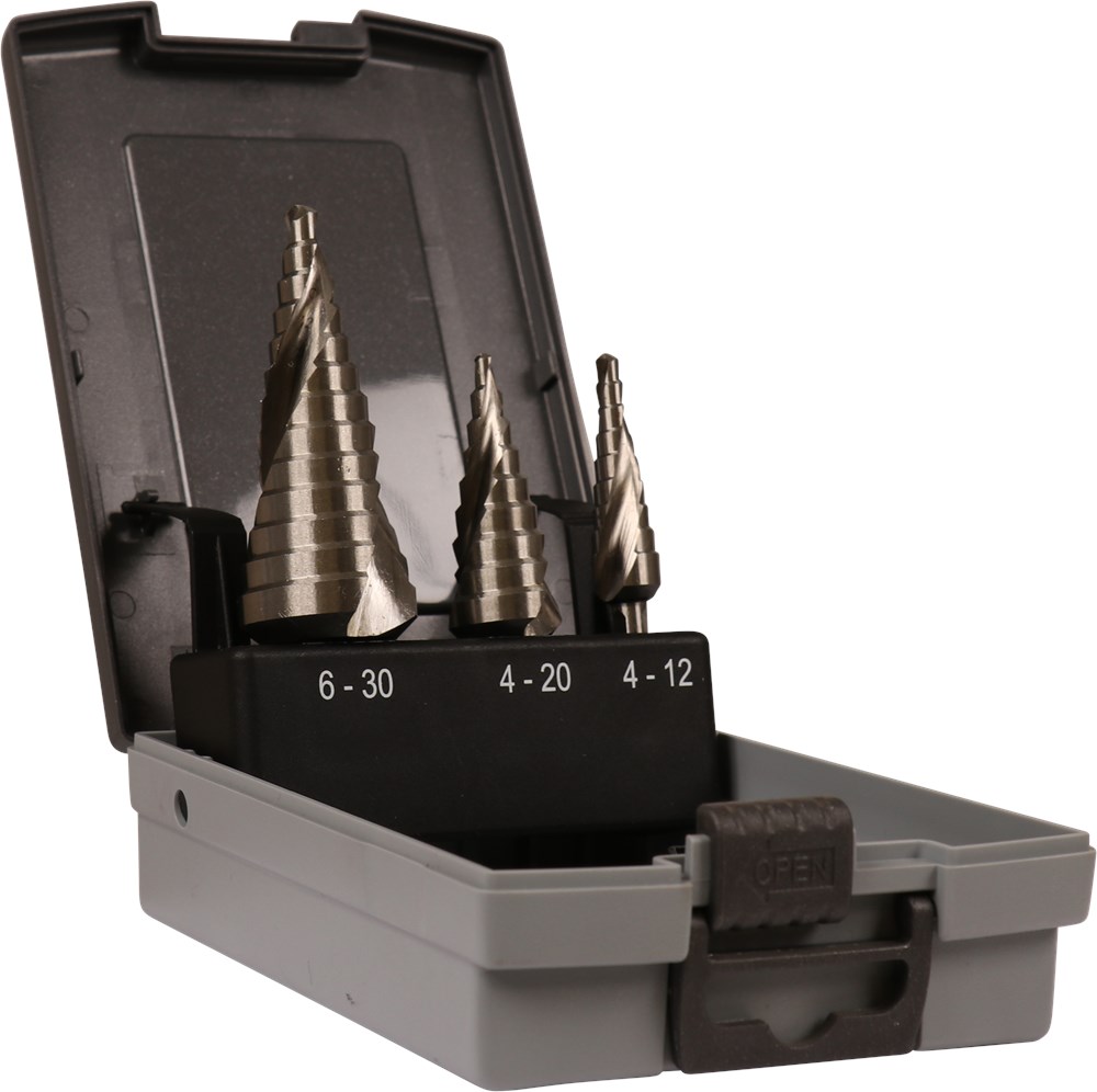 3-delige plaatborenset, in cassette. Met spiraal
