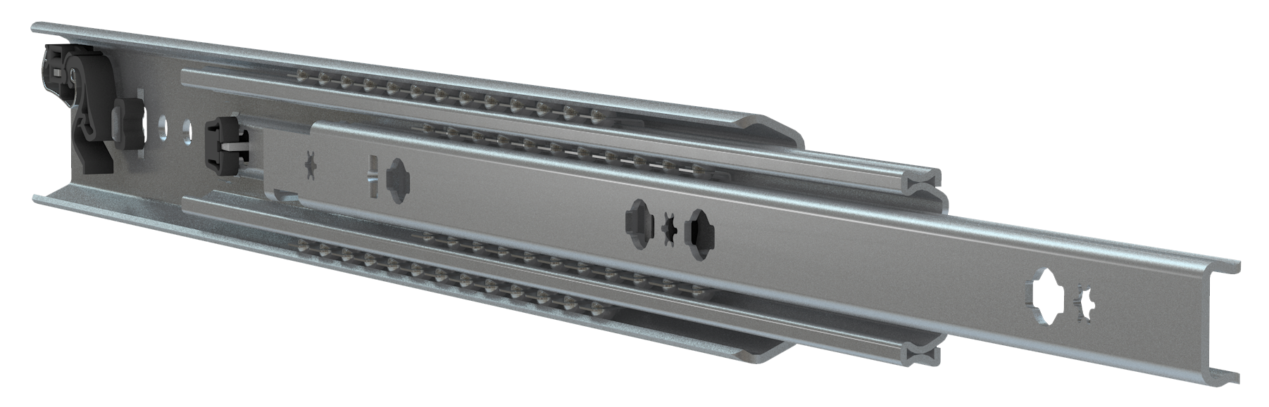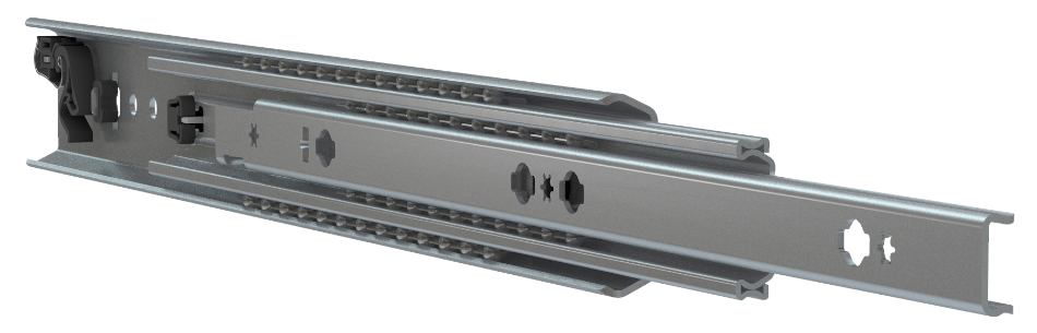 Volledig uittrekbare drie-balks telescopische kogellagergeleider met fail-safe terugtrekfunctie.