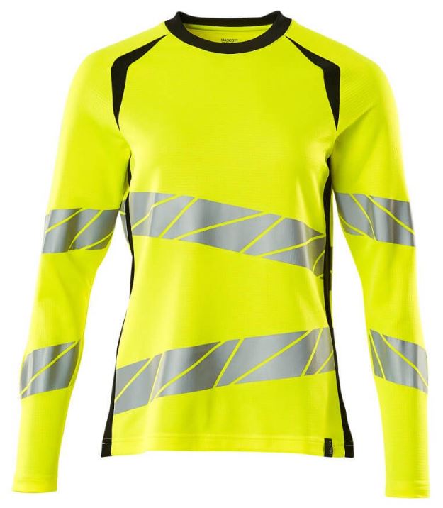 Premium. Vrouwelijke pasvorm. Fluorescerend, met schuine reflectie. Tweekleurig. Moderne pasvorm. Comfortabel katoen aan de binnenkant en duurzaam polyester met stretch aan de buitenkant. Vierkant jacquardpatroon. Elastische reflectieband. Ronde hals. Tricot aan de hals. Verstevigde boord.