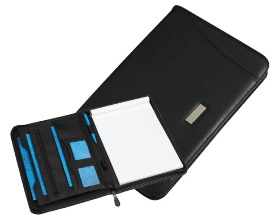 Schrijfmap Excellent de luxe is gemaakt van lederlook materiaal. Aan de linker binnenzijde zitten diverse insteekvakken voor visitekaartjes en documenten. Een insteekvak is afsluitbaar met een rits. * In het midden balpenhouders. Op de rechter binnenzijde vindt u een gelinieerd schrijfblok. De map is afsluitbaar met een rits. Metalen plaatje aan de buitenzijde waarop een tekst/logo middels lasergravure aangebracht kan worden. Kleur zwart.