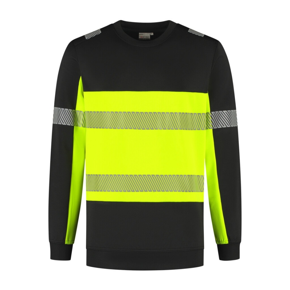 Fluorescerende veiligheids-sweater conform de Europese norm EN 17353:2020 - AB3, double face materiaal: 75% gerecycled polyester (buitenzijde) / 25% katoen (binnenzijde), GRS gecertificeerd, 320 gr/m2, unisex, French terry met geruwde binnenzijde, regular fit, ronde hals, mouw en tailleband in 1x1 rib met elastaan, reflecterende gesegmenteerde LOXY tape op de schouder, mouw en rondom het lichaam.