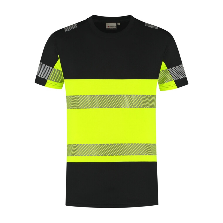 Fluorescerend veiligheids-T-shirt conform de Europese norm EN 17353:2020 - AB3, double face materiaal: buitenzijde 45% gerecycled polyester (buitenzijde) / 55% katoen (binnenzijde), RCS gecertificeerd, 185 gr/m2, unisex, piqué, modern fit, ronde hals in 1x1 rib met elastaan, reflecterende gesegmenteerde LOXY tape op de schouder, mouw en rondom het lichaam. Splitjes in de zijnaad.