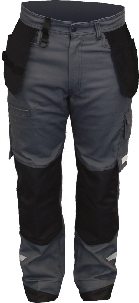 Type Stef. Cordura® versterkingen en drievoudig gestikte naden voor maximale sterkte. De broekspijp is met 50 mm te verlengen door de zoom los te halen. Voorzien van twee steekzakken, twee achterzakken met klep, dijbeenzak met klep, telefoonzak, en potloodzak, dijbeenzak met dubbele duimstokzak en extra knoop om mes aan te hangen, extra steekzak op rechterbovenbeen, hamerlus en reflectiestrepen. Verstelbare taille met elastiek. Gewicht van de stof 300 g/m².
