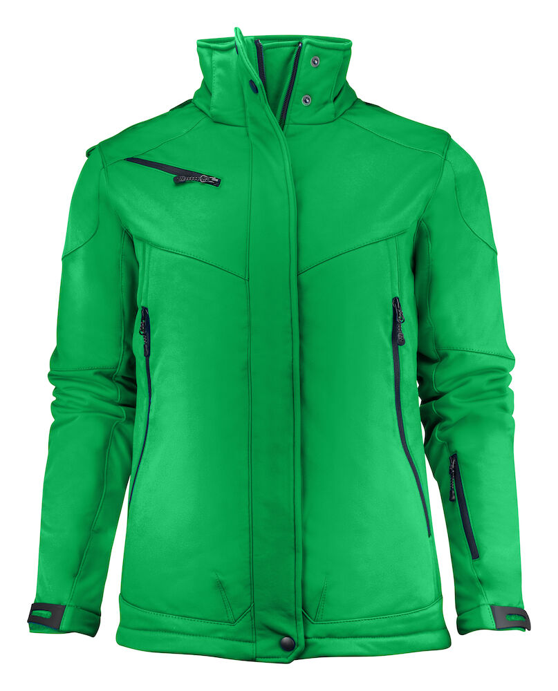 Gevoerde softshell met afneembare capuchon, voorgevormde mouwen en trekkoord onderaan de zoom. De mouwen zijn verstelbaar met velcro. Voorzakken en borstzak met ritssluiting, twee binnenzakken met ritssluiting en één zak in membraanvoering. Standaard wordt deze jas geleverd met zwarte zipper pullers.