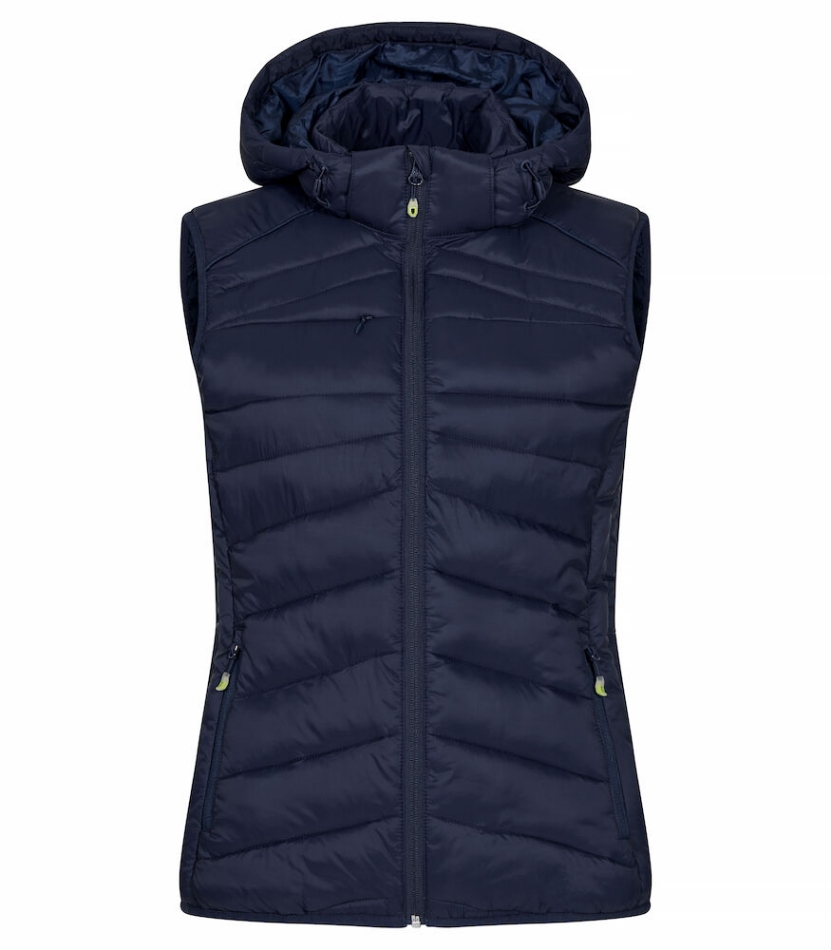 Een warm en toch lichtgewicht vest met donsachtige vulling gemaakt van 100% gerecycled polyamide. Voorzien van 2 zijzakken en borstzak met rits en 2 binnenzakken. De boord en armgaten zijn afgewerkt met een elastische band. Het damesmodel heeft een afneembare capuchon. Afgewerkt met doorvoer voor koptelefoon, ophanglusje in de nek en zipperpuller in een contrasterende kleur.