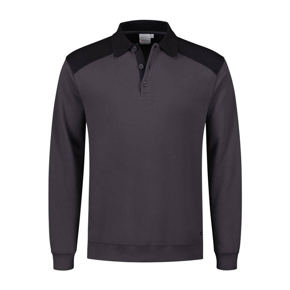 Polosweater, 50% katoen / 50% polyester, 280 gr/m², french terry met geruwde binnenzijde, regular fit met polokraag, 3-knoopsluiting, mouw met ribmanchet, tailleband in 1x1 rib en kraag, schouderstuk in contrast kleur.