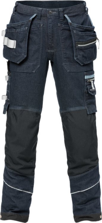 Curdura stretchmateriaal, 2 loshangende met cordura verstevigde zakken, 1 met 3 kleinere zakken en gereedschapslus, 1 met rits, D-ring onder loshangende zak, 2 met cordura verstevigde achterzakken met loshangende onderzijde, 1 met klep en klittenbandsluiting, hamerlus, verstevigde duimstokzak met gereedschapszak, pennenzak, knoop en lus voor werkmes, multifunctionele beenzak met telefoonzak, ID-pashouder, zak met rits en grote zak, met drukknoopsluiting, voorgevormde knieën, verstevigde kniezakken met opening aan de binnenkant voor in hoogte verstelbare kniebeschermers. Materiaal: 73% katoen, 17% polyamide, 8% elastomultiester, 2% elasthaan. Gewicht: 385 g/m²