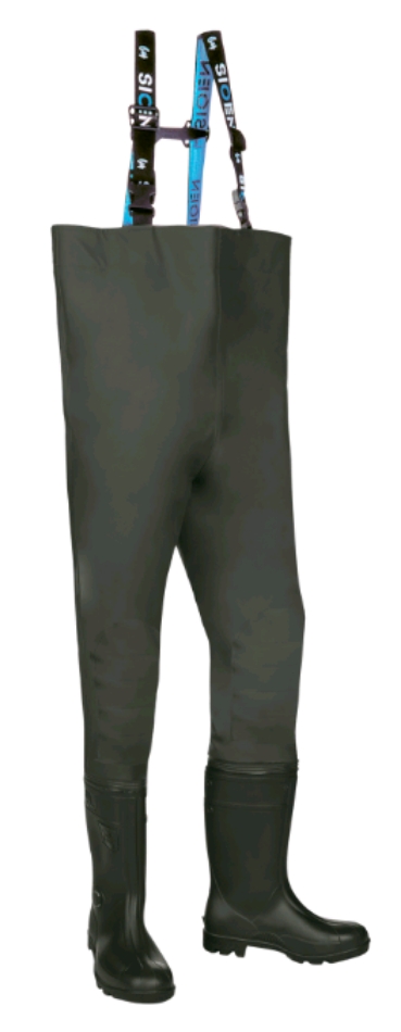 Het waadpak is uitgerust met rubberen veiligheidslaarzen die voorzien zijn van een stalen teenkap en met extra bescherming aan het scheenbeen en met een onpenetreerbare middenzool. De hoge wader is voorzien van bretels met gesp en 1 binnenzak. Ook de knieën werden voorzien van extra versterking zodat u deze hoge wader in tal van omgevingen kunt gebruiken. Materiaal: texoflex: 100% polyester breisel met 100% pvc coating; ± 700 g/m²