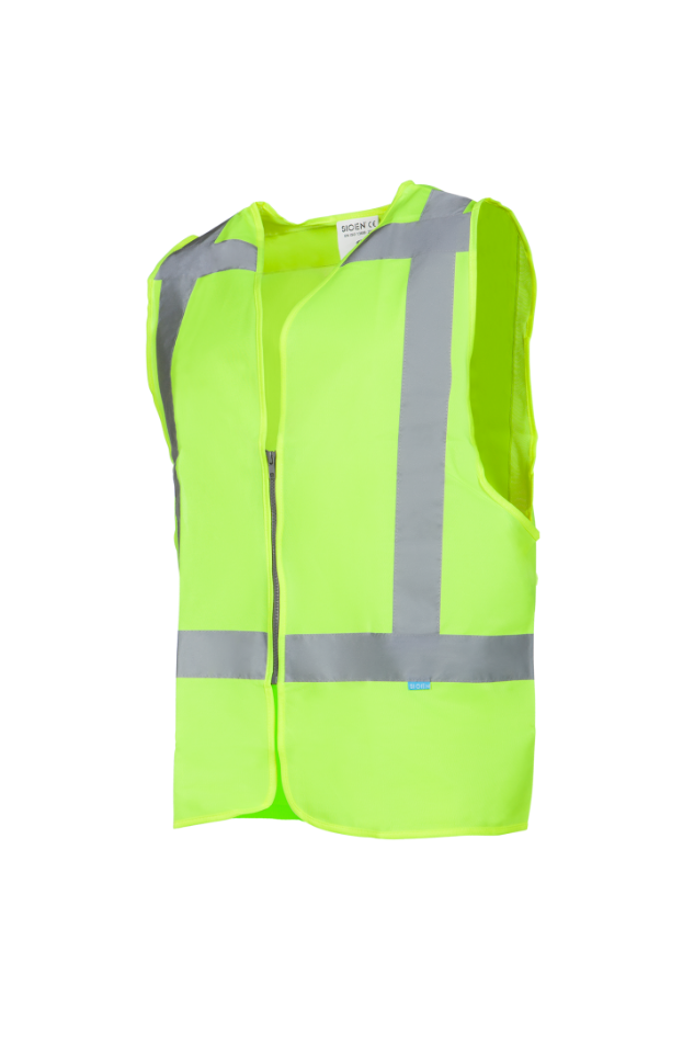 Een signalisatiegilet met reflecterende banden op de buik, rug en schouders. De gilet is afgewerkt met een V-hals en ritssluiting. Europese normering: EN ISO 20471 : 2013 / Class 2, EN ISO 13688 : 2013.