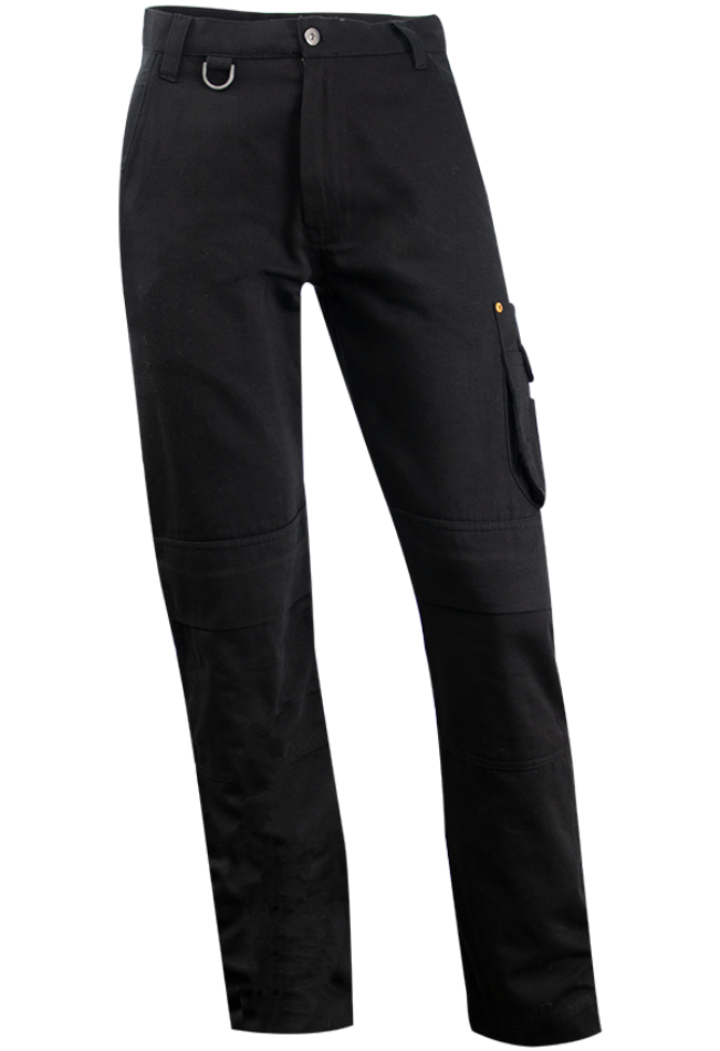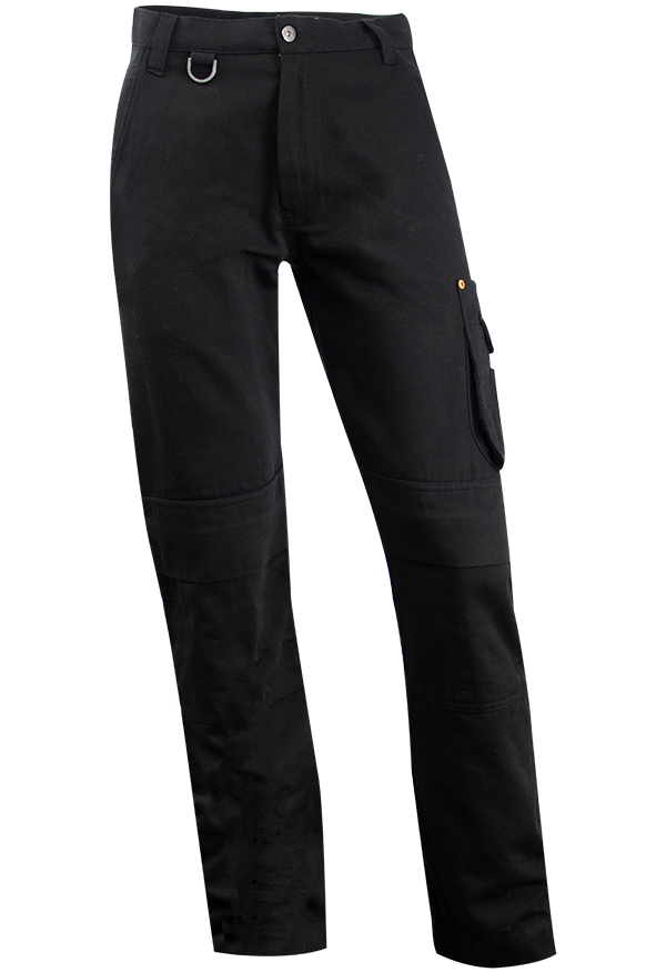 2 steekzakken met coinpocket, multifunctionele zak op linkerdijbeen met klep, achterzakken, riemlussen, hamerlus, duimstokzak, kniezakken t.b.v. kniebeschermers, gewicht: 240 gr./m2.