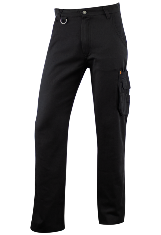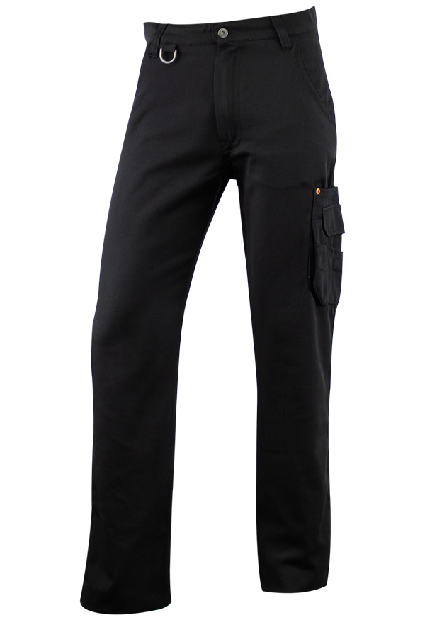 2 steekzakken met coinpocket, multifunctionele zak op linkerdijbeen met klep, achterzakken, riemlussen, hamerlus, duimstokzak, gewicht: 240 gr./m2.
