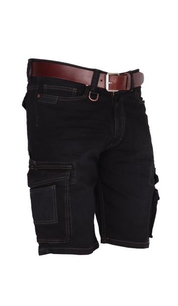 Heren short, stretch, multi pocket, regularfit. Twee dijbeenzakken, duimstok, Hamerlus, uitgebreide opbergmogelijkheden. Authentieke wassing. 69% Gerecyclede Katoen, 30% Nieuwe Katoen, 1% Lycra