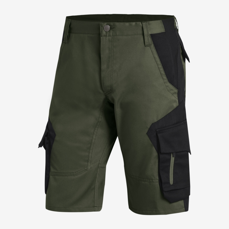 FHB WULF Bermuda, extra voor FHB ontwikkelde stof in een perfecte verhouding van katoen en polyester, elastische inzet in tailleband voor draagcomfort, verhoogde achterzijde, een telefoon- en duimstokzakje links en rechts, extra zakjes voor pen en snijgereedschap, ruime beenzakken met versterkte bodem op beide pijpen, geschikte afstand tussen de riemlussen voor de FHB Holstertassen, innovatieve FHB zaksluiting.