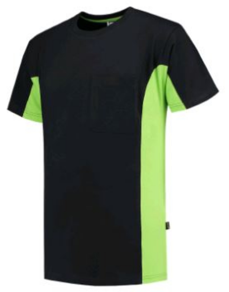 Korte mouw, ronde hals, 4-laags ribboord, borstzak, single jersey, bi-color, 40 graden.