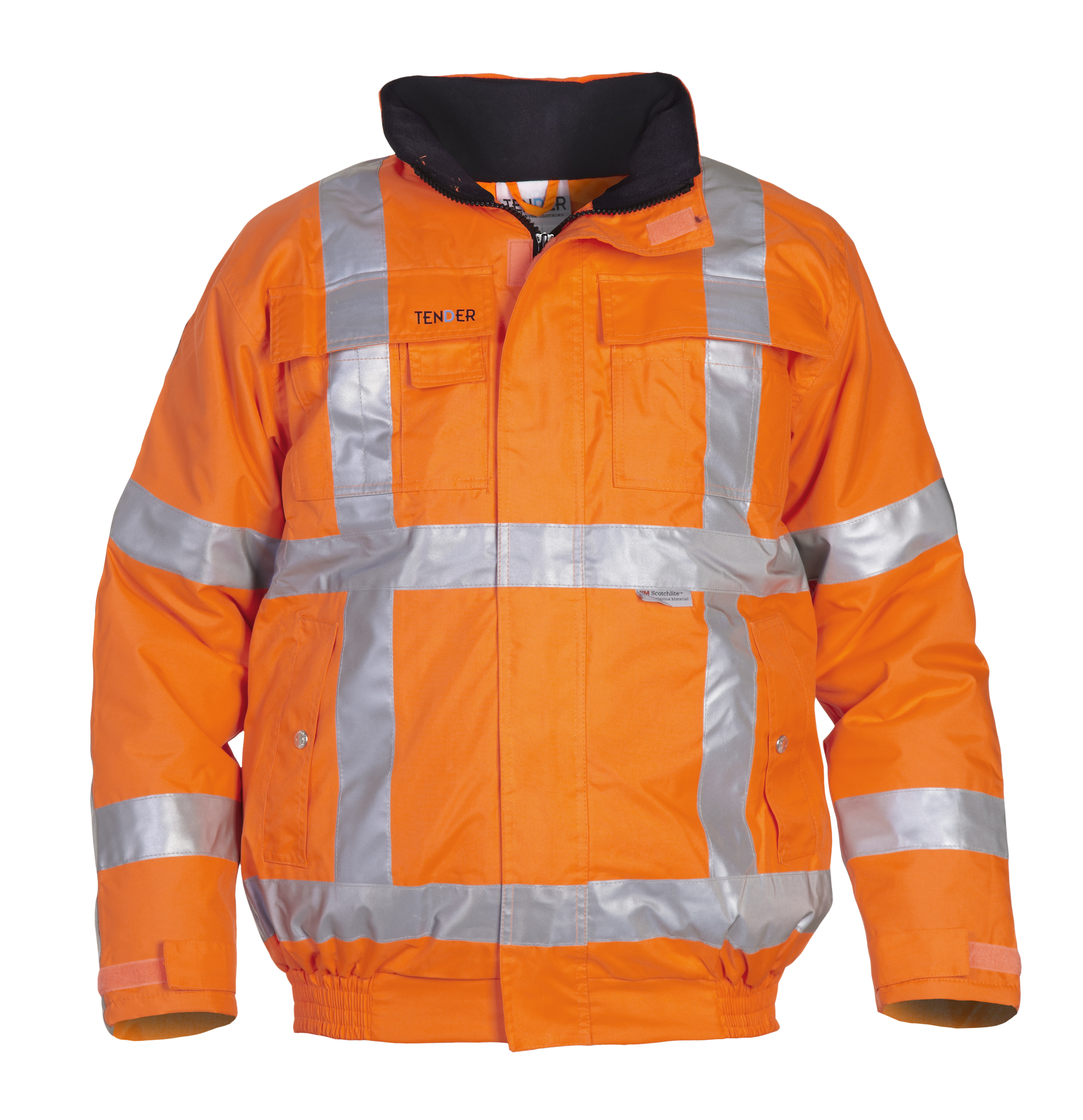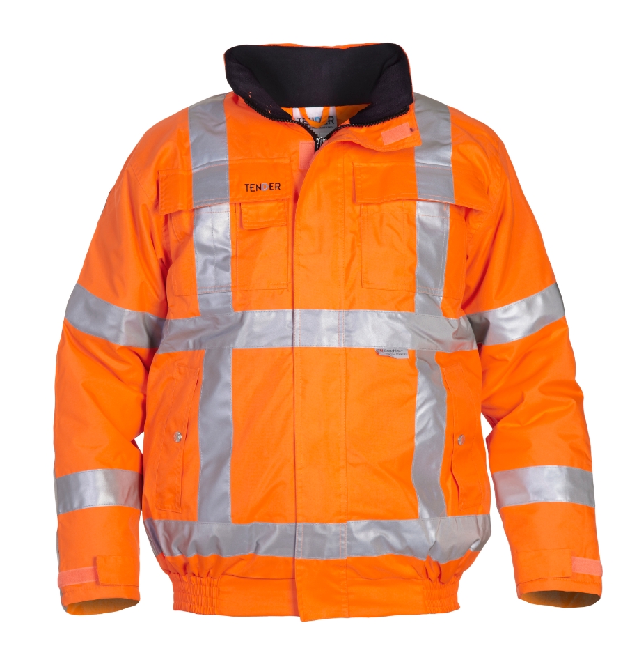 Pilotjack met uitneembare teddyvoering, ritssluiting verdekt met dubbele stormflap en drukknoopsluiting. Verlengd rugpand verstelbaar met drukknopen, capuchon in de kraag met aansnoerkoorden, reflectiebanden over de schouders. Twee steekzakken, twee borstzakken met klep, binnenzak en telefoonpocket. Normeringen: zichtbaarheid Hi-Vis EN471, regenbescherming EN343.