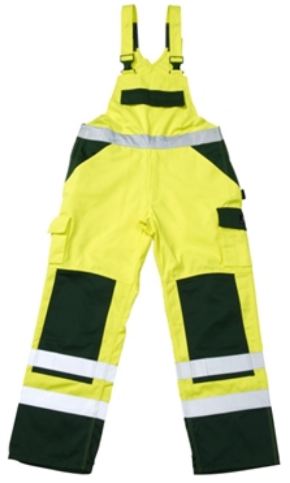 Fluorescerend, met reflecties. Teflon maakt het product vuilafstotend. Tweekleurig. Drievoudig gestikte naden aan de broekspijpen en in het kruis. Verstelbare schouderbanden met korte sterke elastieken en kunststof gespen. Borstzak met klep en drukknopen. Binnenzak met klittenbandsluiting. Verstelbare tailleband. Voorzakken. Gulp met rits. Achterzak met versterkingen - waarvan één met klep en klittenbandsluiting. Verstelbare hamerlus. Steekzak met vakverdeling, klep en verstelbare klittenbandsluiting. Pennenzakjes. Telefoonzak op de dijbeen met klep en verstelbare klittenbandsluiting. Duimstokzak. Kniezakken.