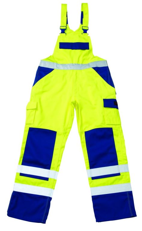 Fluorescerend, met reflecties. Teflon maakt het product vuilafstotend. Tweekleurig. Drievoudig gestikte naden aan de broekspijpen en in het kruis. Verstelbare schouderbanden met korte sterke elastieken en kunststof gespen. Borstzak met klep en drukknopen. Binnenzak met klittenbandsluiting. Verstelbare tailleband. Voorzakken. Gulp met rits. Achterzak met versterkingen - waarvan één met klep en klittenbandsluiting. Verstelbare hamerlus. Steekzak met vakverdeling, klep en verstelbare klittenbandsluiting. Pennenzakjes. Telefoonzak op de dijbeen met klep en verstelbare klittenbandsluiting. Duimstokzak. Kniezakken.