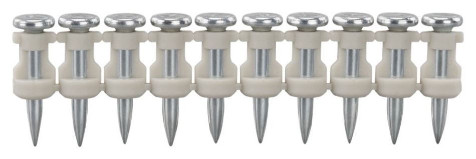Betonnagels voor het bevestigen van metal stud en hout op beton voorzien van gegalvaniseerde coating. 1 gaspatroon meegeleverd. 10 nagels per strip. Het is ook mogelijk om de nagels op staal te bevestigen . Aanbevolen penetratie diepte per betonklasse: C16/20 25-28 mm C20/25 20-22 mm C25/30 15-20 mm C30/37 15-18 mm Aanbevolen penetratie diepte per staalsterkte: 350 N/mm2 6,5 mm Prijzen zijn aan verandering onderhevig.