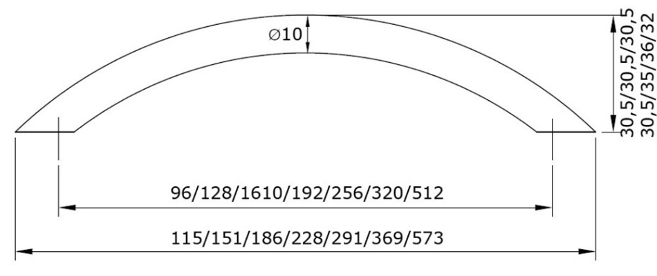 Meubelgreep Boog, gebogen 10mm brugmodel met een hart-op-hart maat van 512mmB = 573 en D = 35mm, de diameter is ΓΈ10mm.