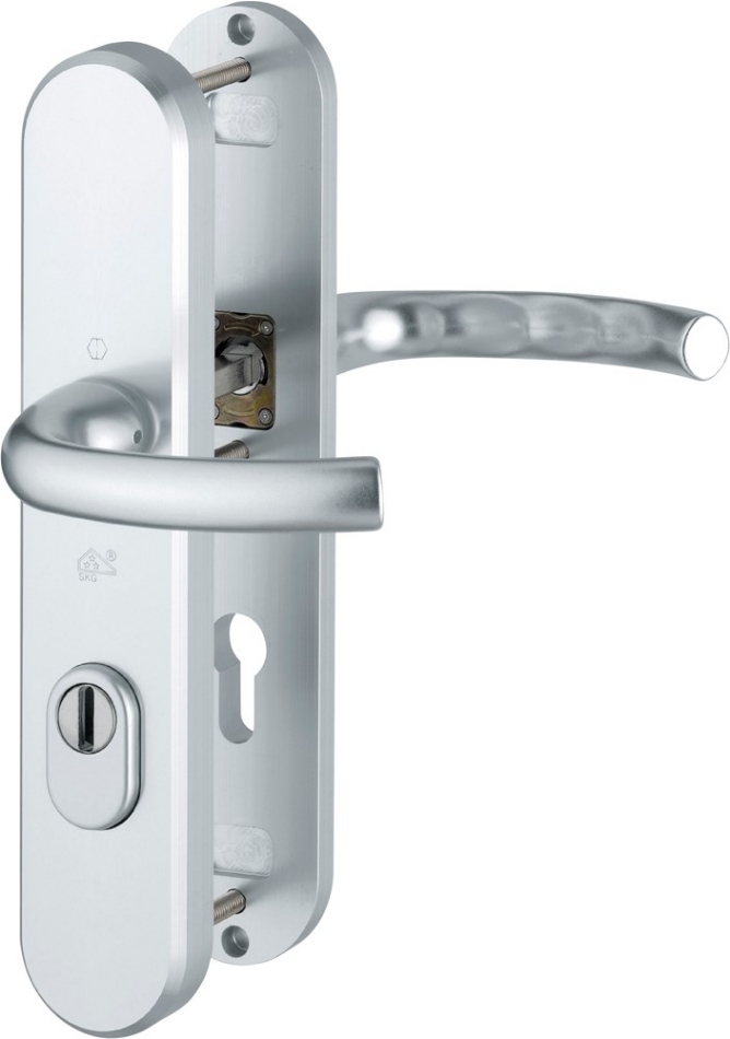 HOPPE afgerond inbraakwerend deurkrukgarnituur van massief aluminium, met rondom facet, conform DIN 18257 en NEN 5089, SKG®***-keurmerk. Buitenzijde uitgevoerd met cilinder-kerntrekbeveiliging en stalen nokken, deurkruk met HOPPE-snelstiftverbinding. Binnenzijde voorzien van hooghoudveer met zichtbare bevestiging met 3 x M6 kruiskop Bouten en deurkruk-gatdeel.